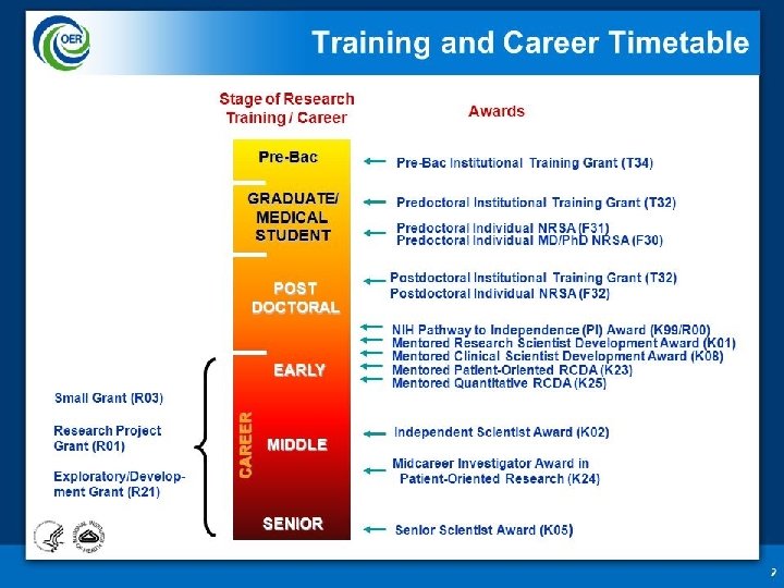 Mentored to Independent Investigator Early Training Award recipients: F 31/ F 31 Equivalent Awards (predoctoral) NRSA TL 1, T 32 Mentored Award Recipients: F 32, T 32, K & K Equivalent Independent: R or R equivalent: K 24 Midcareer Mentor Award