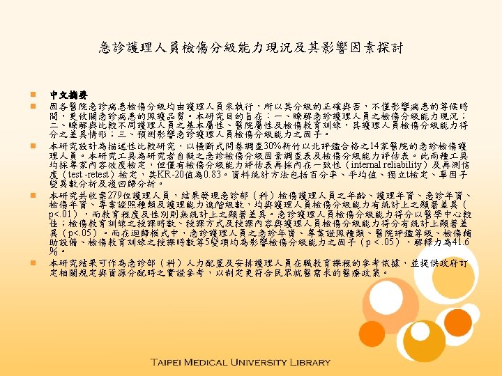 The Current Status quo of Triage Nurses Competency and Related Factors in the Emergency Department n n 英文摘要 Beasuse the triage is usually perfomed by nurses in the emergency department; therefore, the accuracy of triage level assignment is important because it is not only affected the patient waiting time, but also associated with the quality of patient care. The aims of this study were 1) to understand the status quo of the triage nurses competency, 2) to understand compare the differences between demographics of nurses, level of hospitals, and triage education training, and nurses’ triage scores, 3) to predict the impact factors related to nurses’ competency scores. The design was descriptive comparison study using cross-sectional questionnaire to survey nurses from 30% of hospitals in northern of Taiwan. Two instruments were used in this study, including self-developed emergency triage questionnaire and triage competency assessment tool. The validity of these two instruments was assessed by content analysis. Only the triage competency assessment tool was also assessed by internal reliability test and test-retest. The result KR-20 was 0. 83. Data were analyzed by percentage, mean, independent t-test, one-way ANOVA, and regression analysis. A total of 279 nurses participated in this study. The results were indicated that nurses triage competency was influenced by nurses’ age, working experience, years of working experience in the emergency department, type of certifications, level of clinical ladder. However, a significant difference was not found (p<. 01) from above variables. Moreover, a significant difference was not found between level of education and gender and nurses triage competency. Nurses who work in the medical center have higher scores of triage than those of non-medical centers. A significant difference was also found between the hours of education training and type of continuing nursing education, and the contents of education and nurses’ triage competency (p<. 05). For the regression analysis, factors related to the nurses working experience in the emergency department, types of certifications, level of hospital accreditation, triage assistants, hours of education training were found related to nurses’ triage competency. The variance of explanation was 41. 6%. The findings not only provide information to nursing resource management and continuing nursing education, but also to assist government to set health policy and to resource allocation to meet the needs of public.