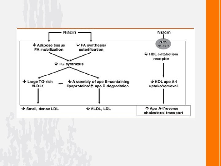 NIACIN AS ANTIHYPERLIPIDEMIC q 1 -3 g/day niacin increases HDL level by 10 -30 % making it most powerful agent to increase HDL cholesterol. q. Recommended form of niacin for raising HDL is sustained release preparations. REFERENCES 36: Rader, Daniel J. (2004). "Raising HDL in Clinical Practice". Raising HDL in Clinical Practice: Clinical Strategies to Elevate HDL. http: //cme. medscape. com/viewarticle/479499_5. Retrieved October 8, 2009. Chapman, M. John; Assmann, Gerd; Fruchart, Jean-Charles; Shepherd, James; Sirtori, Cesare; European Consensus Panel on HDL-C (2004). "Raising high-density lipoprotein cholesterol with reduction of cardiovascular risk: the role of nicotinic acid – a position paper developed by the European Consensus Panel on HDL-C". Current medical research and opinion 20 (8): 1253– 68 Meyers, C. Daniel; Carr, Molly C. ; Park, Sang; Brunzell, John D. (2003). "Varying Cost and Free Nicotinic Acid Content in Over-the-Counter Niacin Preparations for Dyslipidemia". Annals of Internal Medicine 139 (12): 996