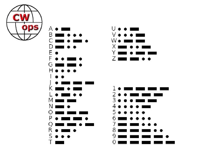 Summary of CW Advantages • • • Universal language. No need to know a language to convey basic information Simpler equipment required Easier to work DX stations, some of which use only CW Signal-to-noise ratio benefit of 12 d. B Less recognizable RFI into consumer electronics, because CW sounds like faint clicks versus garbled voice Narrower bandwidth required so more room on the band Smaller antennas needed given the 12 d. B benefit Security – most listeners can’t easily decode it Great fun to have an expertise in a magical communications medium Enormous satisfaction in being able to communicate in Morse Code And, perhaps most important…. .