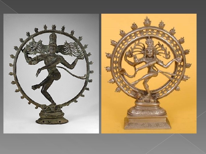 The Shiva Nataraja This is the god Shiva dancing his cosmic dance. It is believed that the energy from this dance sustains the cosmos, and when Shiva is finished with this dance, this universe will end a new one will begin. Shiva has a few special characteristics, for example, the third eye in his forehead. He stands in a circle of flames with one foot on the demon Apasmaradurusa, who symbolizes ignorance. He holds a drum in his right hand, symbolizing the rhythm of the cosmic dance. "Shiva Nataraja, " or "Lord of the Dance. " Shiva dances the cosmic dance of destruction on the body of the "dwarf of ignorance. " “Shiva Nataraja (The Dancing Shiva)”. Bronze sculpture. Southern India, ca 1400.