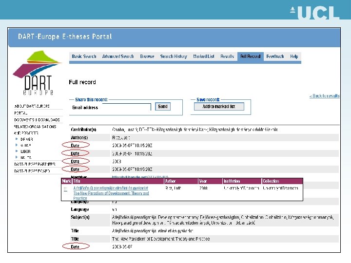 DART aggregation: overview Institutional Repository + Consortial/ National Repository Metadata E-thesis Metadata + Aggregator Metadata Collection (OAI-PMH) HARVESTING Crosswalks Clean-up Enrichment User Interface Accented characters POST-PROCESSING Indexes Storage DATA MANAGEMENT SEARCH BROWSE RESULTS
