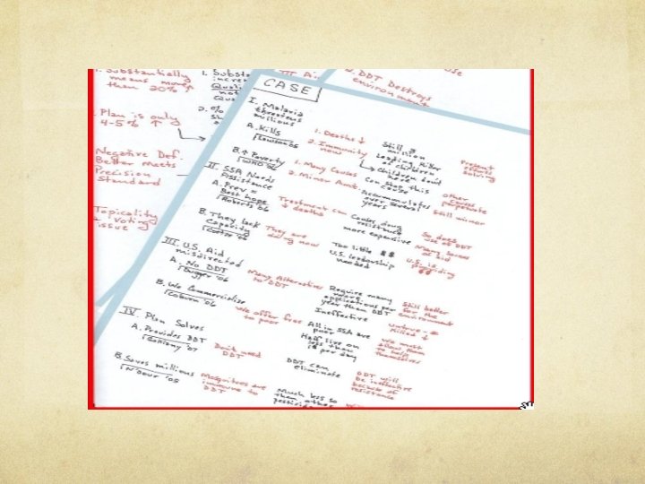 SOME RULES FOR FLOWING One argument per page Two colors—one for aff, one for neg One column for each speech Lots of room/space Shorthand symbols Substance of an argument, not word for word Flow every argument in round