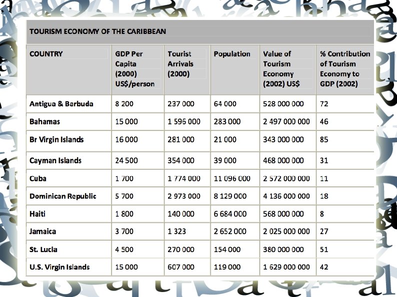 Negative Effects of the D. E. Religious beleifs, dress, music, eating habits, and commercial pratices. . . Large-scale tourist developments changed rural living patters Seasonal work patterns created Traditional skills of some workers were lost (from fishing to boat tour guide) Local art, music, and clothing styles were commercialized to cater to tourists Local foods, music, clothing styles were changed or influenced by North American Styles Local properties and areas of natural beauty were commercialized Crime levels increased.