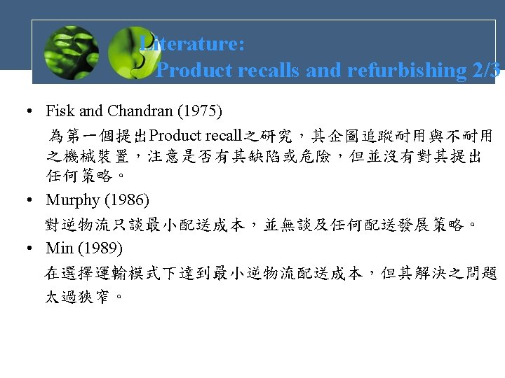 Literature: Product recalls and refurbishing 3/3 • Refurbishing: 主要對於回送後的產品進行所需之改變,使其顧客滿意。 ( Lund, 1984 ) • 其議題包含:Recycling, Reduction, Reclamation, Recovery, Reuse, Remanfacturing. (Guintini and Ansel, 1995)