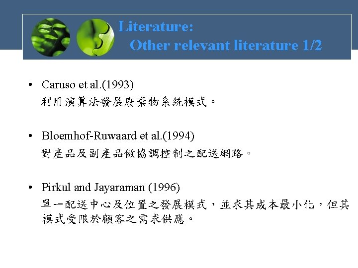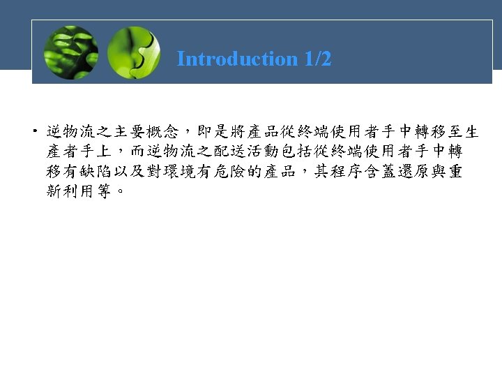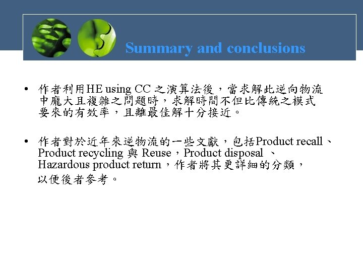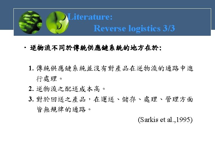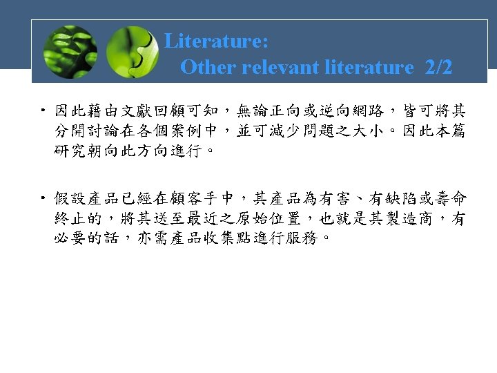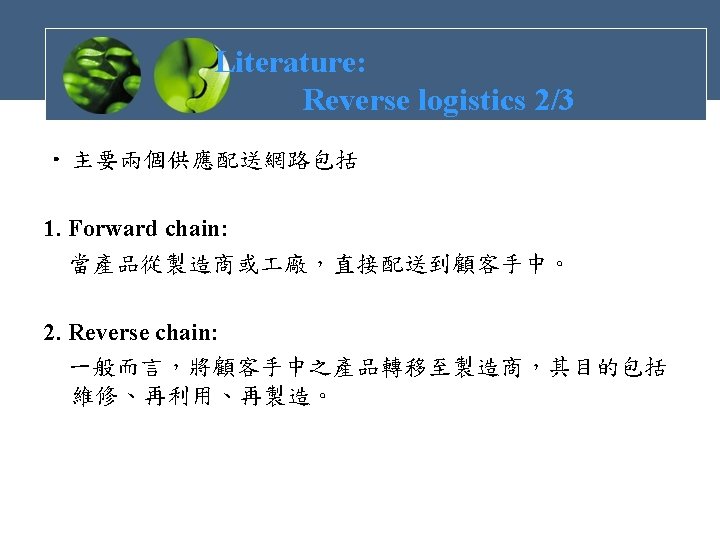 Literature: Reverse logistics 1/3 • 逆物流處理之四個主要基本原則: 1. Reduce 2. Substitution 3. Reuse 4. Recycle