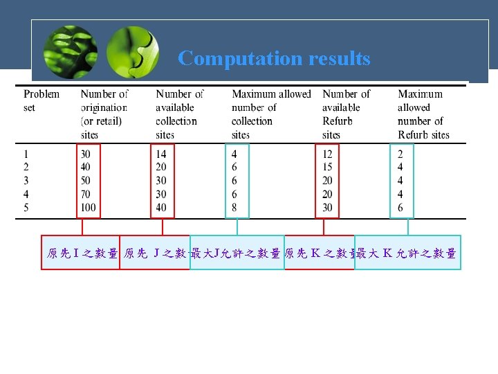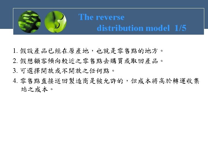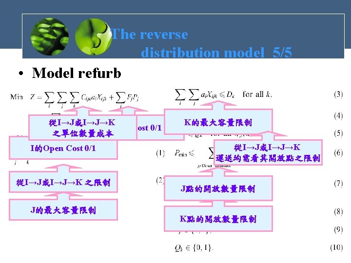 The reverse distribution model 4/5 The decision variables for the model are: • Xijk––fraction of units at origination site i that is transported through collection site j and onto refurbishing site k. • Pj 1 if collection site j is open; 0 otherwise: • Qk 1 if refurbishing facility k is open; 0 otherwise: 小部份直接 從I→K之產品 開放與不開放