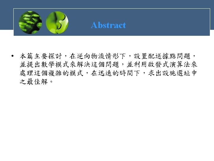 CONTENT • Abstract • Introduction • Literature: Reverse logistics Product recalls and refurbishing Other relevant literature • The reverse distribution model • The solution approach • Computation results • Summary and conclusions
