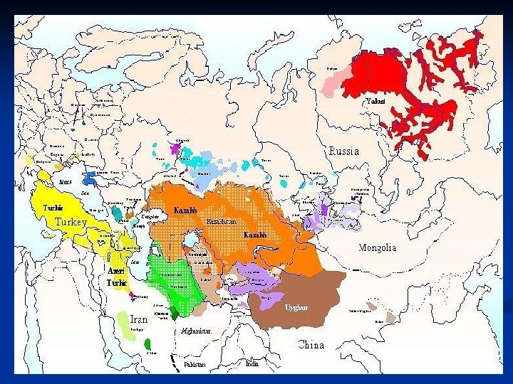 General overview of Turkish n 1. 2. 3. 4. 5. Main geographic locations of Turkish languages Turkey (Turkish) Azerbaidjan (Azerbaidjani) The formerly Soviet Central Asia, Kazakhstan, Southern Siberia (Uzbek, Kazakh, Turkmenian, Kirghiz) On the Volga (Tatar) In northwestern China (Uighur)