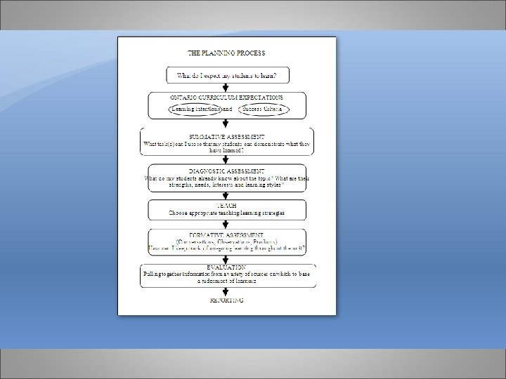 The Difference Between Assessment and Evaluation Assessment is the systematic and ongoing process of collecting, describing, and analyzing information about student progress and achievement in relation to curriculum expectations and the achievement chart. The primary purpose of assessment is to improve student learning by providing the information needed to direct the modification and refinement of programs to better meet student needs. Evaluation is the process of integrating and synthesizing summative assessment information from various sources and using this information: • to make inferences and judgments about how well students have achieved the curriculum expectations; and • to determine the worth and to place a value (a letter or percentage grade) on a student’s achievement of the expectation in relation to the achievement chart provided in the Ontario Curriculum for each subject discipline.