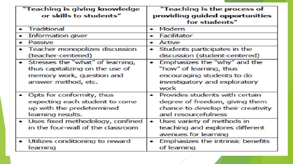 Traditional Teaching Traditional teaching is concerned with the teacher being the controller of the learning environment. Power and responsibility are held by the teacher and they play the role of instructor (in the form of lectures) and decision maker (in regards to cirriculum content and specific outcomes). They regard students as having 'knowledge holes' that need to be filled with information. In short, the traditional teacher views that it is the teacher that causes learning to occur (Novak, 1998)