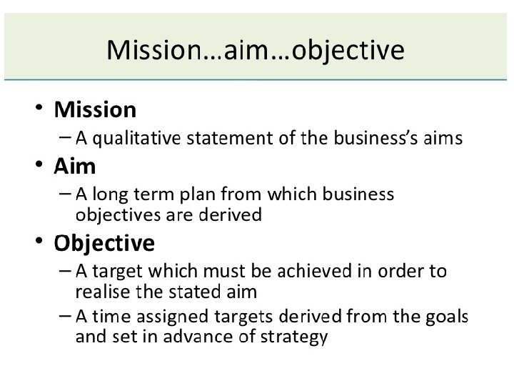 Why do organisations have aims and objectives? If you don’t know where you are going, how do you know when you’ve got there? • So all staff know what they are trying to achieve • So that we can compare ‘actuals’ with ‘targets’ • To motivate employees • To give a sense of direction and focus