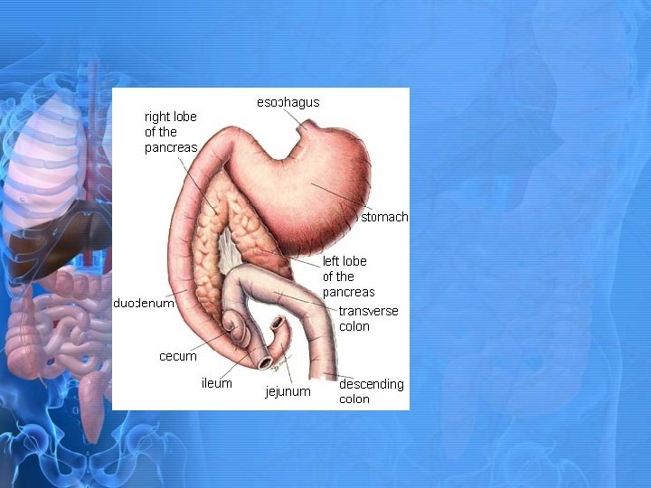 Liver • Produces bile acids that help to digest fat. • Helps to filter materials absorbed from GI tract before they reach blood. • Hepatic portal system- is blood vessel system that transports blood from capillaries in the intestine to liver. • Some nutrients are stored or metabolized by the liver. • Bile is produced in liver and leads to gallbladder. • Source of blood proteins • Albumin