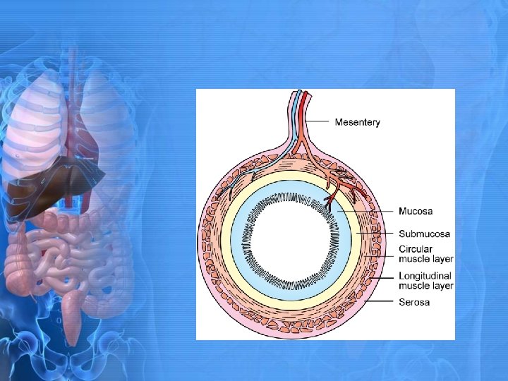 Digestive Tract Structure • Mesentery - Sheets of connective tissue • Suspends digestive tube from dorsal body wall • Contains blood vessels, lymph vessels, and nerves that supply GI tract