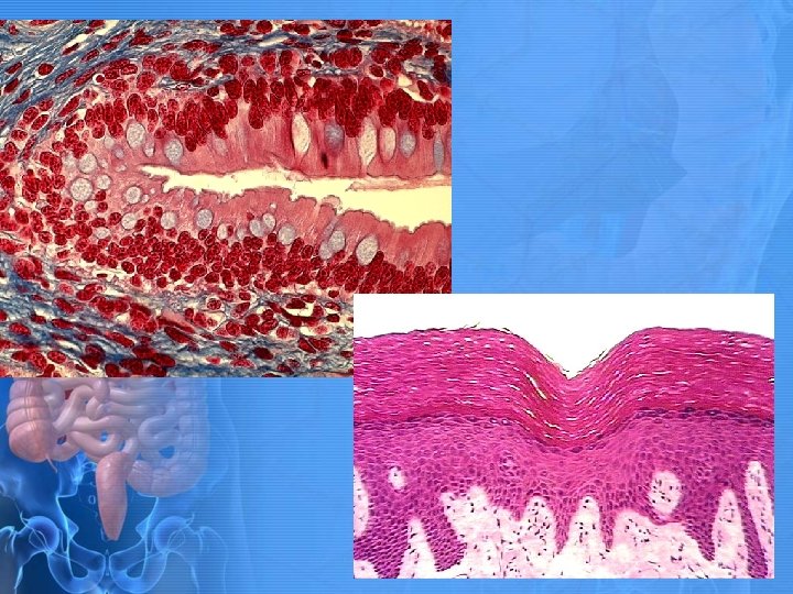 Epithelium of the Digestive Tract • 2 types • Stratified Squamous • Thick and tough. • Lines mouth, pharynx, esophagus, and anus. • Simple Columnar • Change occurs where esophagus enters stomach. • Allows for better absorption of nutrients.