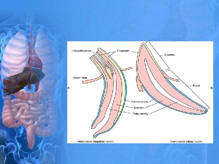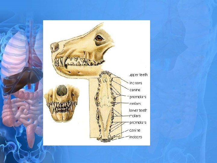 Types of Teeth • • Incisors • Grasping teeth • Most rostral teeth of upper and lower arcade Canines • Tearing teeth • Located at corners of incisors • Longer than other teeth • Pointed at tip Premolars • Cutting teeth • Rostral cheek teeth • Sharp points and surfaces in carnivores Molars • Grinding teeth • Caudal cheek teeth • Larger, flatter occlusal surfaces • Used for grinding