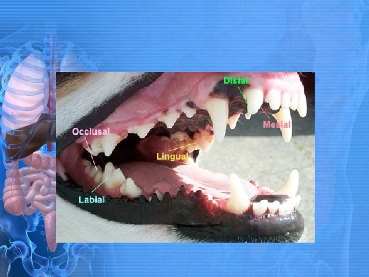 Teeth Surfaces • Lingual (tongue)- inner surface of lower arcade • Palatal (hard palate)- inner surface of upper arcade • Labial (lips)- outer surface of upper/lower arcades (rostral) • Buccal (cheek) - outer surface of teeth (caudal) • Occlusal – surface that grinds with other teeth