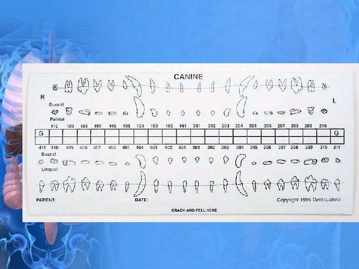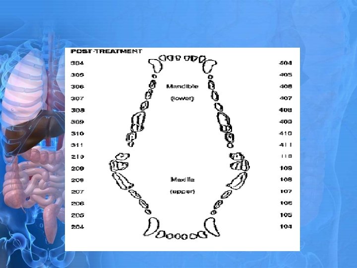Numerical Dental Charting • Each quadrant of the dental arcade is assigned a particular number. • Upper right quadrant is 100 • Upper left quadrant is 200 • Lower left quadrant is 300 • Lower right quadrant is 400 • Each tooth is assigned a number according to position.