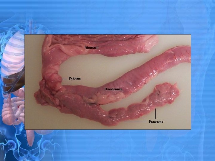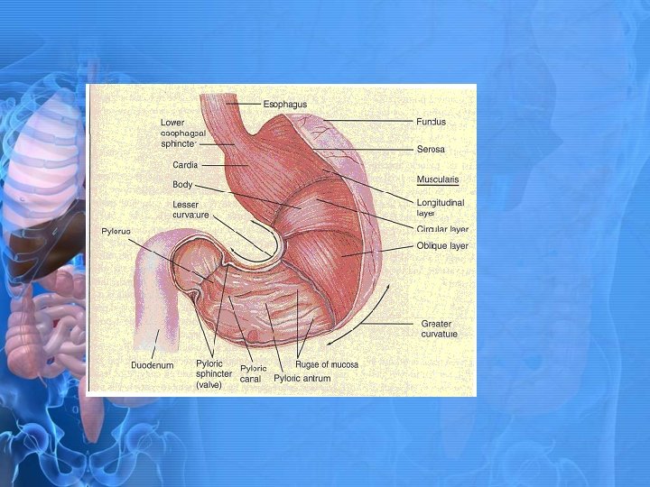 Stomach continued • • Cardia • Where esophagus enters stomach. • Helps reduce reflux Fundus & Body • Forms a pouch that can distend as more food is swallowed • Rich with glands Pyloric Antrum • Distal part of the stomach that grinds food. • Regulates hydrochloric acid Pylorus • Sphincter that regulates digested stomach contents (Chyme) from stomach to duodenum (first part of intestine). • Prevents backflow of duodenal contents into the stomach.