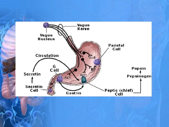 Stomach secretions continued • Intrinsic factor- protein that combines with vitamin B 12 that aids in absorption of this vitamin. • Pepsinogen- precursor to pepsin which breaks down proteins to chains of amino acids. • Peptides (chains of amino acids) stimulates release of gastrin (from which cells? ) which increases hydrochloric acid production and pepsinogen release. • Pepsin is inactivated from p. H change from stomach to intestine. • Which area has a higher p. H? • Which area has a lower p. H?