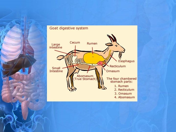 Ruminants and Complex Stomachs • Only have one true stomach (abomasum), but have 3 forestomachs (reticulum, rumen, and omasum).