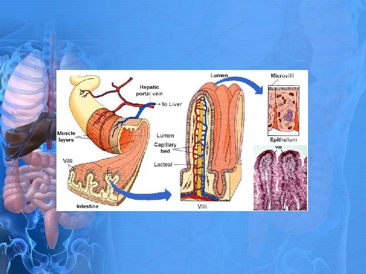 Mucosa of Small Intestines • Provides large surface area for absorbing nutrients. • Folds in intestinal wall • Villi- tiny, cylindrical, fingerlike projections that help with absorption. • Each villus contains very small villi called microvilli (brush border). • Crypts- small invaginations in the intestinal mucosa that help with replenishing cells of villus. • What cells produce mucus? • Diseases that affect villi?