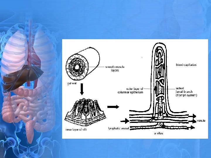 Small Intestine Digestion • Must be chemically broken down to absorb in small intestine are: • Carbohydrates • Proteins • Fats • Chemically digested by • Enzymes in lumen of intestine • Enzymes of microvilli • Once digested “unit” of foodstuff can be transported or diffused across intestinal tract membrane