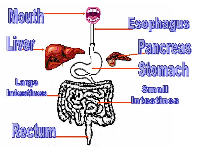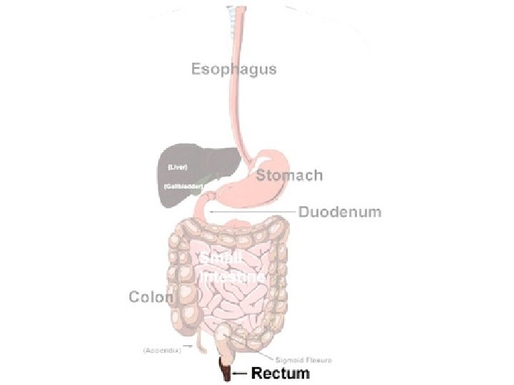 The Large Intestine continued… • The remaining material is ready for elimination from the body. • Rectum- a short tube that is the last portion of the large intestine. • Waste material is pressed into a solid form. • Waste material exits through the anus, a muscular opening at the end of the rectum.