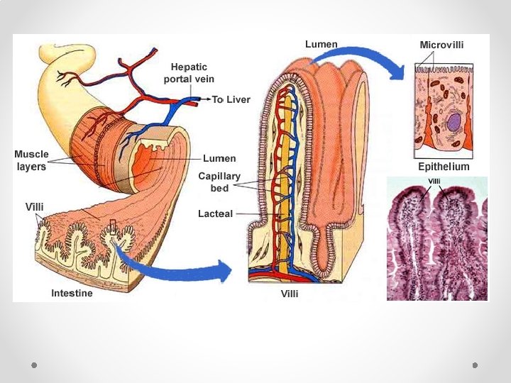 Special Structures of the Small Intestine • villi o Fingerlike structures formed by the mucosa o Give the small intestine more surface area • microvilli o Small projections of the plasma membrane • plicae circulares o Deep circular folds of the mucosa and submucosa o Do not disappear when filled with food • Peyer’s patches o collections of lymphatic tissue in ileum o Immune surveillance