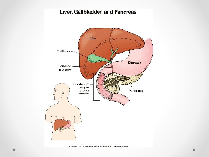 Liver • Largest gland in the body • Manufactures bile o Bile breaks fat into smaller globs for lipases (fat-digesting enzymes)to work on • The liver consists of four lobes suspended from the diaphragm and abdominal wall by the falciform ligament • It’s connected to the gall bladder via the cystic duct