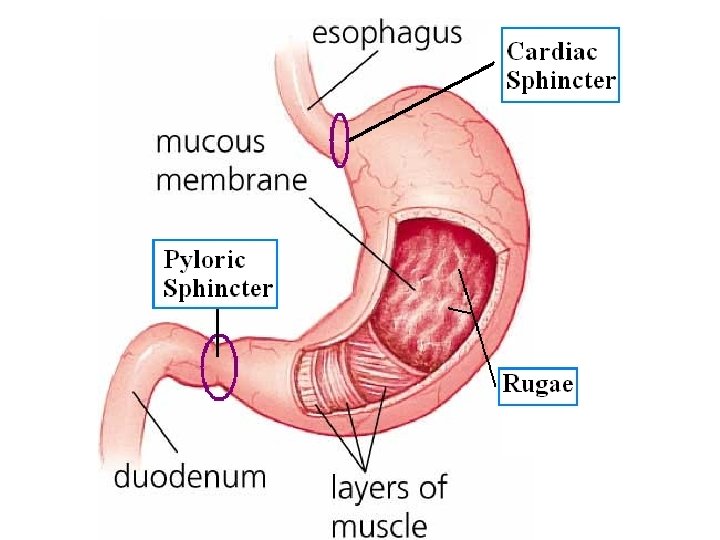 Digestion - STOMACH • Sphincters: circular muscles that open and close to control what goes in or out 1. Cardiac Sphincter: allows food to enter stomach from the esophagus 2. Pyloric Sphincter: allows food to exit the stomach and enter the duodenum (small intestine) • Rugae: folds of stomach lining ( Surface Area, nutrient absorption)