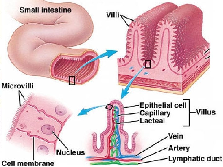 INCREASING SURFACE AREA Absorption (Surface Area) is increased in 3 ways: 1. Villi (singular = villus) – fingerlike projections (folds) in the intestinal wall – Surface Area 2. Microvilli – microscopic, mini-folds along each villus – Surface Area 3. Lacteals – vessels that run through the villi – absorption of fatty acids + glycerol