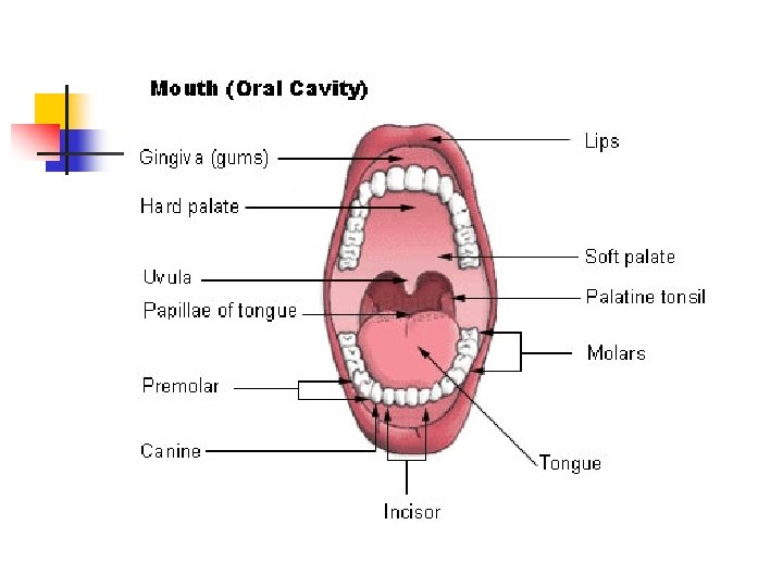 Mouth – primary site of digestion n Reduces size of food particles (mechanical digestion) Mixes with saliva (chemical digestion) Lips, cheeks, tongue, and palate n n Oral cavity – between palate and tongue Vestibule – narrow space between teeth and cheeks