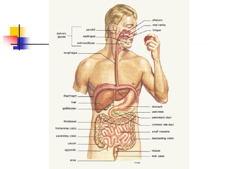 Human Digestive System Digestion – the breakdown of food and absorption of resulting nutrients by cells n Structures n Alimentary canal (mouth, pharynx, esophagus, stomach, small intestine, large intestine, anal canal) n Accessory (teeth, tongue, salivary glands, liver, gall bladder, pancreas) n n Basics: tube, open at both ends, 186 m 2