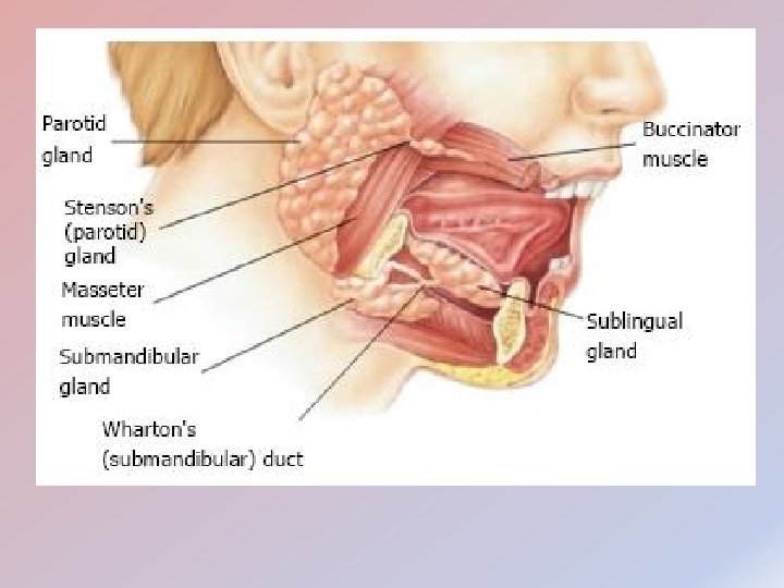 • STAGE I – INGESTION Ø The Mouth - digestion starts with 3 organs: : tongue : six salivary glands : teeth - when you eat something, the teeth break up the food the salivary glands produce saliva which moistens the food & contains AMALASE which begins starch digestion