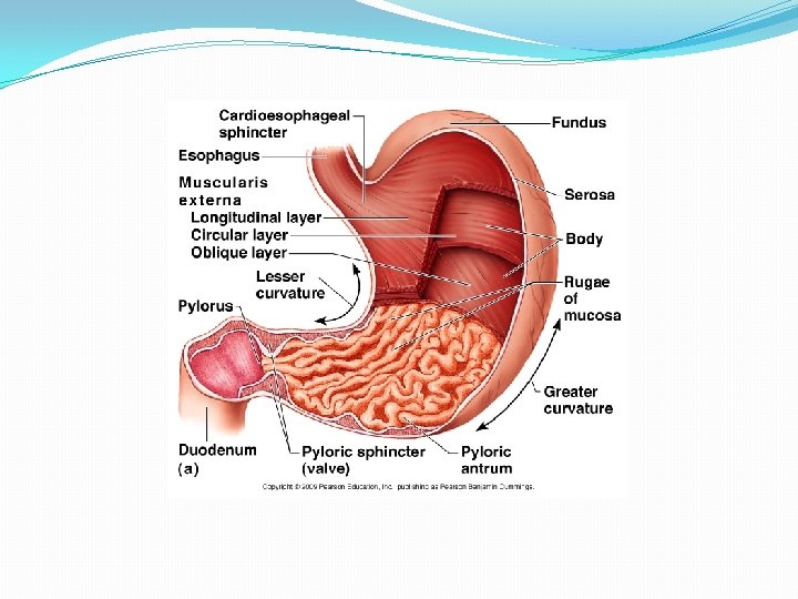 1. . Stomach (Cardia) • Mucosa contains simple or branched tubular cardiac glands • Terminal portion of these glands are frequently coiled, often with large lumens. • Similar in structure to cardiac glands of the terminal portion of esophagus. 2. . Stomach (Fundus & Body) • Simple columnar surface epithelium extends into gastric pits into which opens into gastric glands. • Lamina propria consist of fine reticular and collagen fibres fills the spaces between the packed gastric glands. • Each gastric gland has 3 distinct region: o Isthmus o Neck o Base • Isthmus contains differentiating mucous cells and undifferentiated stem cells and parietal cells. • Neck consist of stem, mucous neck and parietal cells. • Base contains parietal and chief (zymogenia) cells. • The muscularis mucosa composed of inner circular and outer longitudinal smooth muscle.