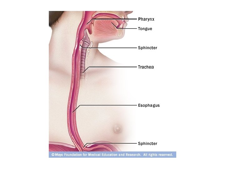 Esophagus • 10 inch tube that connects the pharynx with stomach • Located between trachea and spine • Peristalsis moves food from pharynx to stomach • Mucus is secreted in lining to moisten and aid in movement of food