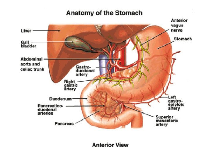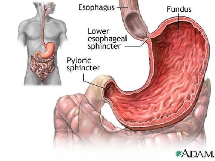 Stomach • Located between the esophagus and the small intestines • sphincters at each end control movement of material in and out • Contains pepsin • Contains HCL(hydrochloric acid); acidic environment aids digestion • Lining secretes mucus to protect stomach wall against being burned by HCL