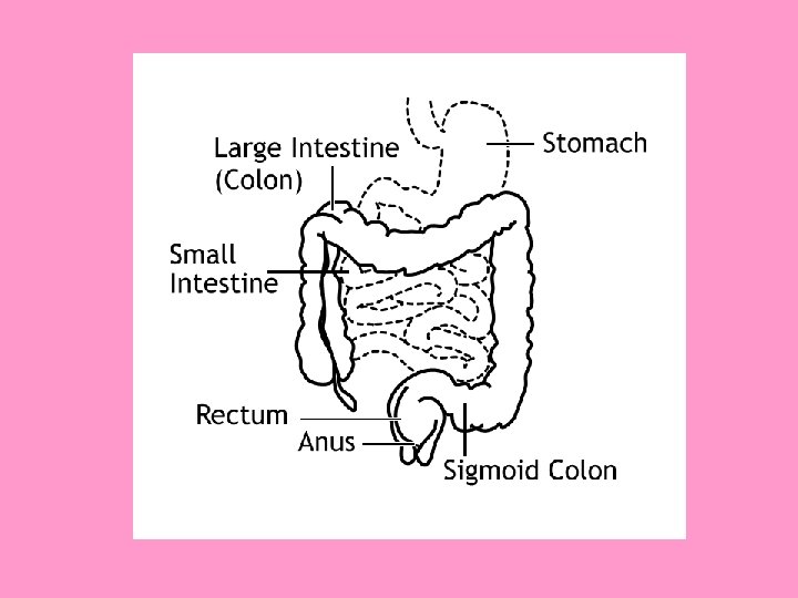 Large Intestine § The large intestine is also called the colon. It receives approximately 10 liters of water per day. 1. 5 liters is from food and 8. 5 liters is from secretions into the gut. 95% of this water is reabsorbed. § The large intestine also absorbs sodium and other ions but it excretes other metallic ions into the wastes. § If water is not absorbed, diarrhea can result, causing dehydration and ion loss. § It absorbs vitamin K produced by colon bacteria. § The last 20 cm of the large intestine is the rectum. Feces is composed of approximately 75% water and 25% solids. One-third of the solids is intestinal bacteria, 2/3’s is undigested materials.