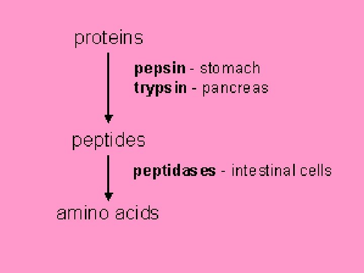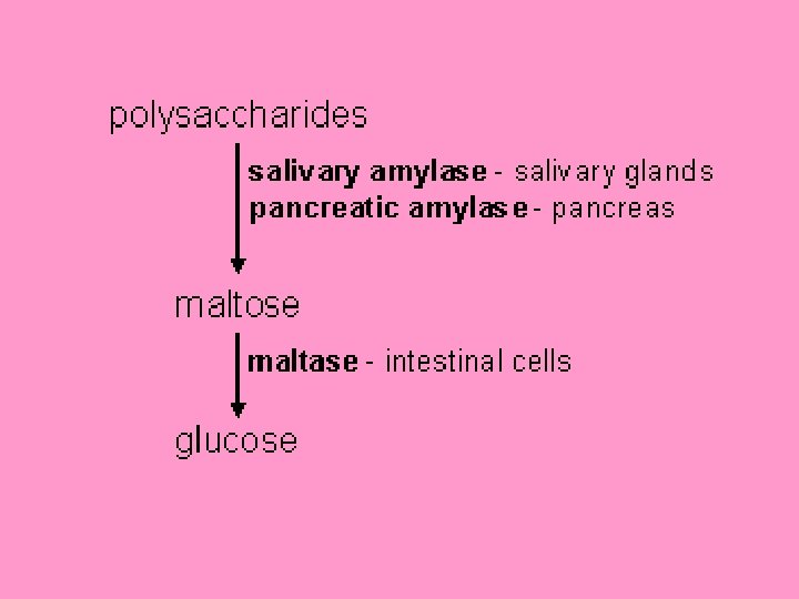 • Polysaccharides • Proteins • Fats maltose peptides glucose amino acids fatty acids + glycerol