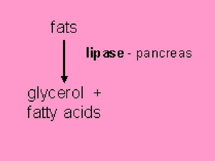Pancreatic Juice § Pancreatic juice contains sodium bicarbonate which neutralizes the acidic material from the stomach. § Pancreatic amylase digests starch to maltose. § Trypsin and Chymotrypsin digest proteins to peptides. Like pepsin (produced in the stomach), they are specific for certain amino acids, not all of them. They therefore produce peptides. § Lipase digests fats to glycerol and fatty acids.
