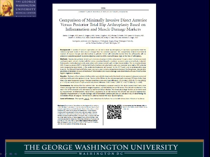 DAA RECOVERY EASIER MAY BE FASTER & A prospective, randomized study compared DL THA and DAA approach THA. Using numerous validated outcome measures the DAA THA had significantly better improvements at 6 weeks, 6 months, and 1 year than did the direct lateral approach THA. Restrepo C, Parvizi J, Pour AE, Hozack WJ. Prospective randomized study of two surgical approaches for total hip arthroplasty J Arthroplasty. 2010; 25(5): 671 -679. e 1.