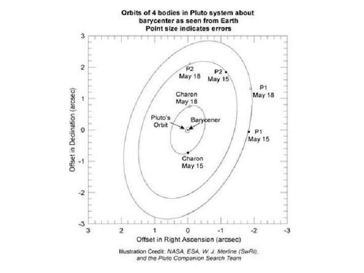 The “quadruple planet” Pluto Visual magnitude Diameter Orbital radius * (barycentric) Orbital period * Pluto 14. 2 2328 km +/- 42 km 6. 387 days Charon 16. 2 1208 km +/- 4 km 6. 387 days S/2005 P 1 22. 93 +/- 0. 12 61 -167 km 64, 700 km 38. 2 days (3. 7 x Charon) (~6 x Charon) S/2005 P 2 23. 38 +/- 0. 17 46 -137 km 49, 400 km 25. 5 days (2. 8 x Charon) (~4 x Charon) New moons are 5000 x fainter, 12 x smaller, and 3 -4 x farther out than Charon, with possible 6: 4: 1 orbital resonances