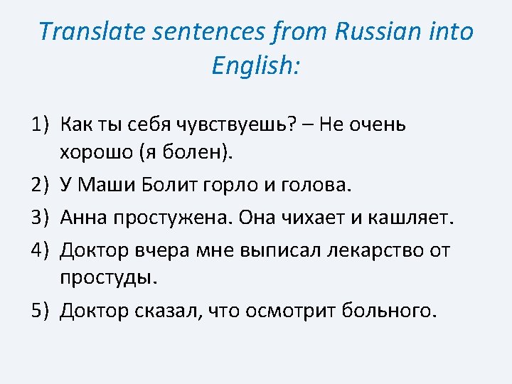 Let’s read the following words. Translate them. medicine, temperature, bad, bed, day, age, have, shall, gentleman, again, later, and, help