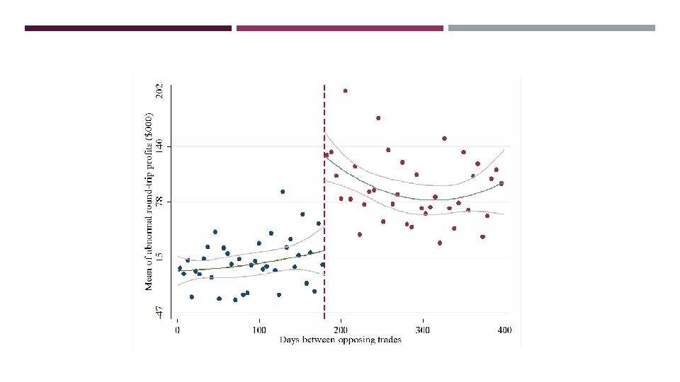WHAT WOULD ONE EXPECT TO OBSERVE? Trading on material non-public information is illegal. This suggests that insiders engaged in illegal insider trading would be unlikely to report such trading on Form 4 presumably the most profitable trades not reported Relatedly, it may be the case that insiders with information that would be expected to affect the value of the stock over a short window (such as 20 days) may be dissuaded from trading due to concerns about their trades being considered illegal insider trading would expect insiders who trade not to make significant profit in the days following the trade Consistent with the finding that informed trading proxies are negatively correlated with $$$ profits. Managers who believe their company is over or under valued and who are willing to wait for their profits are least likely to run afoul of illegal insider trading laws would expect round-trip profits to be greatest given that the average holding period is over 2 years in the data The data represent a subset of reported transactions by insiders (excluding derivatives and excluding firms with certain data availability limitations and lack of analyst coverage) this may depress observed round-trip profits by excluding firms with greater informational asymmetries between insiders and the market