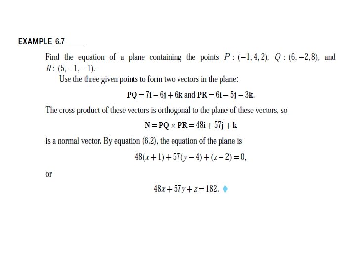 • Example: • We will find the equation of the plane P containing the point (− 6, 1, 1) and orthogonal to the vector N=− 2 i + 4 j + k. Such a vector N is said to be normal to P and is called a normal vector to P. • Here is a strategy. Because (− 6, 1, 1) is on P, a point (x, y, z) is on P exactly when the vector between (− 6, 1, 1) and (x, y, z) lies in P. But then (x +6)i+(y − 1)j+(z − 1)k must • be orthogonal to N, so N· ((x +6)i+(y − 1)j+(z − 1)k)=0. • Then • − 2(x +6)+4(y − 1)+(z − 1)=0, • or • − 2 x +4 y +z =17. • This is the equation of P.