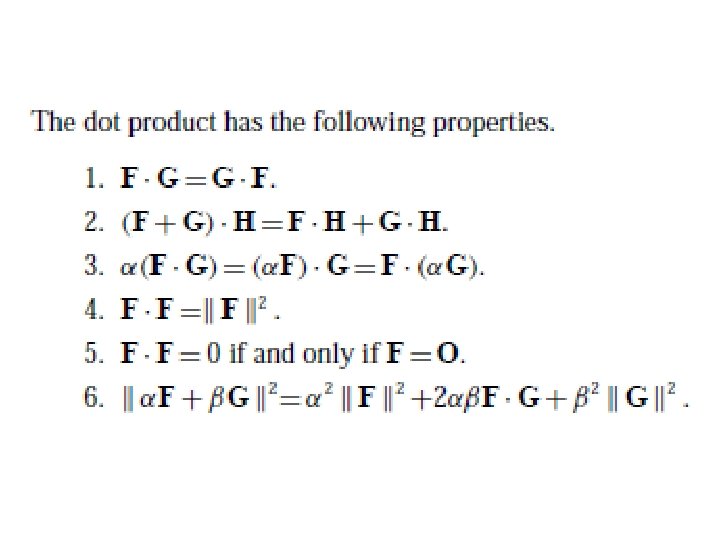 • EXAMPLE 6. 4 • Let F=− 4 i+j+2 k, G=2 i+4 k and H=6 i−j− 2 k. • • Then F ·G=0, so F and G are orthogonal. • But F · H and G · H are not zero, so F and H are not orthogonal and G and H are not • orthogonal.