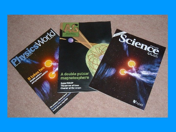 The Double Pulsar System: Summary Pulsar A B Pulsar period (ms) 22. 7 2774 Stellar mass (solar masses) 1. 34 1. 25 Projected semi-major axis (lt-s) 1. 4 1. 5 Characteristic age (Myr) 210 50 6 x 109 2 x 1012 5800 x 1030 2 x 1030 Surface magnetic field strength (Gauss) Energy loss rate due to spin-down (ergs/s) Distance (pc) Orbital inclination (degrees) Orbital period (hours) Eccentricity 500 90 2. 45 0. 088 First double pulsar system ever, and most extreme and relativistic pulsar binary system ever! (Lyne et al. 2004, Science, 303, 1153)
