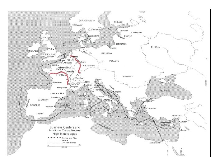The First Textile Crisis: Warfare and rising transaction costs (1290 s) - 4 • 3) Major changes in trade + trade routes: from 1290 s to the 1320 s • a) rapid decline & fall of Champagne Fairs: on which N-S textile trades had been based • b) shift from continental overland trade routes maritime trade routes: • Italy to NW Europe: by 1320 s (Venice: 1314) • BUT: from 1332 -1400: Venice’s Flanders Galleys made only 24 north-bound voyages