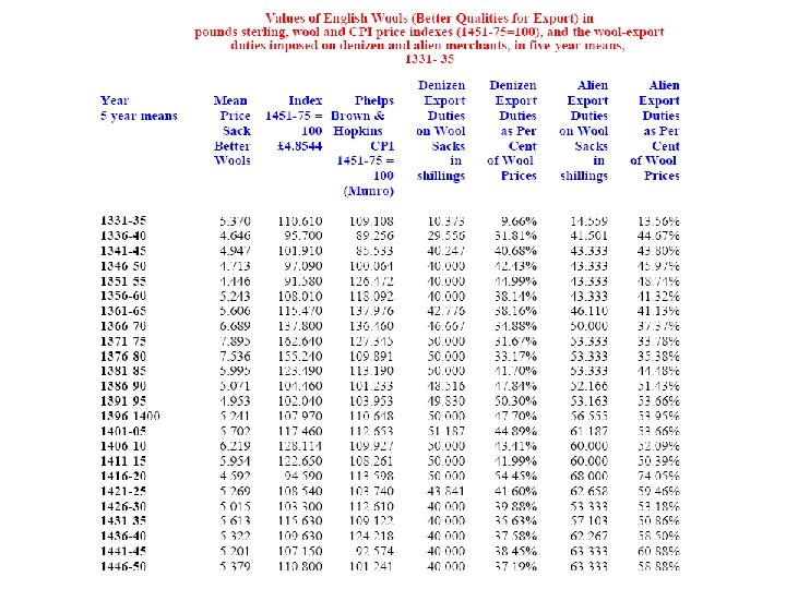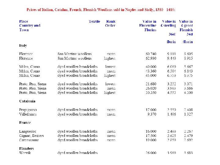 The Second Florentine Textile Crisis: from 1370 s - 3 • - e) English tax burden ROSE with later deflationary fall in wool prices, because export taxes were ‘specific’ • - from a mean of 13. 6% per sack value in 1331 -35 to 54. 0% in 1396 -1400 (vs. 47. 7% per sack for ‘denizen’ exports) • f) Fine English wool: were single most important determinant of both luxury quality and of cloth prices: • - evidence from Low Countries (1430 s) that tax burdened English wools accounted for 65% - 70% of total costs (before dyeing and finishing)